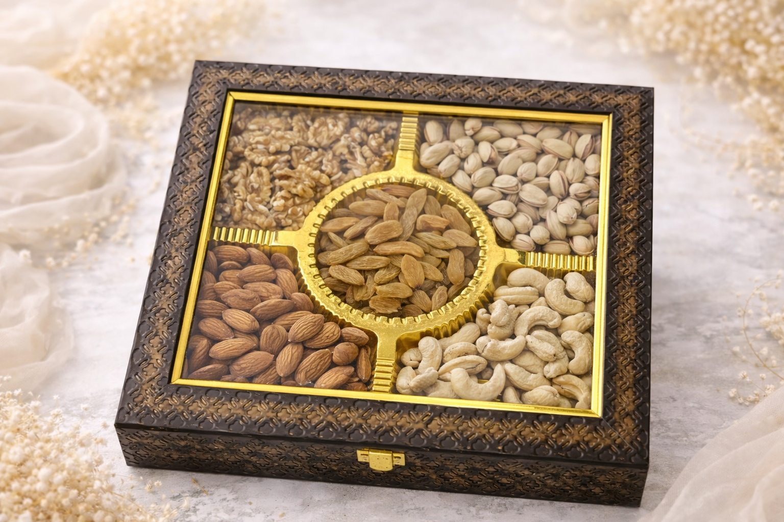 Elegant nut box with golden accents