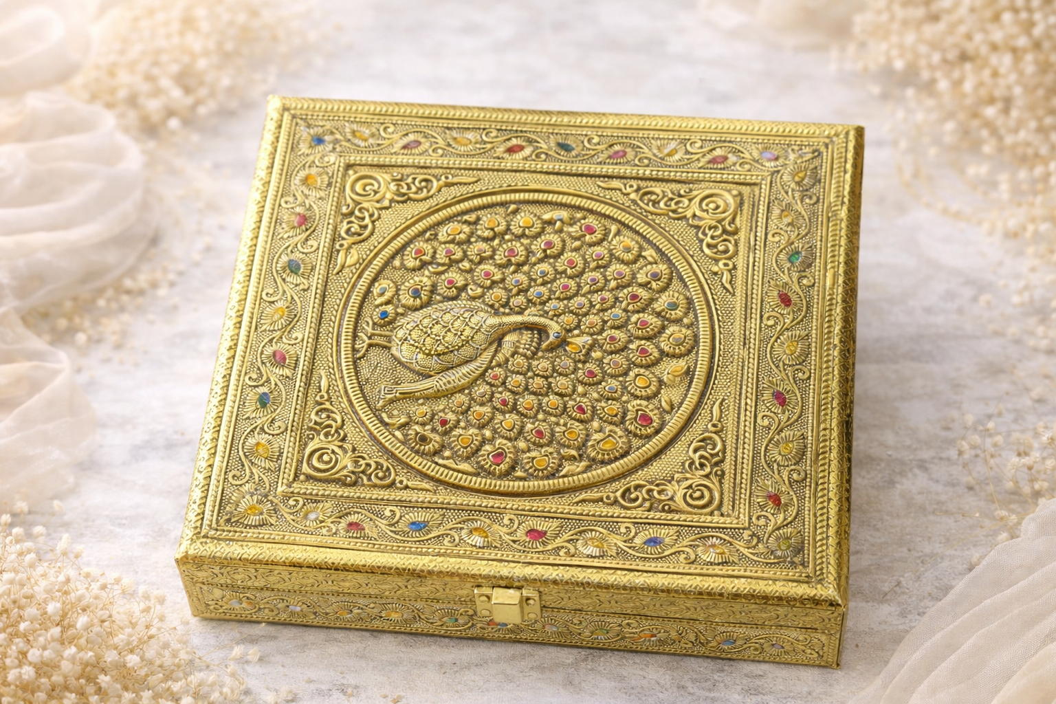 Intricate gold box with peacock